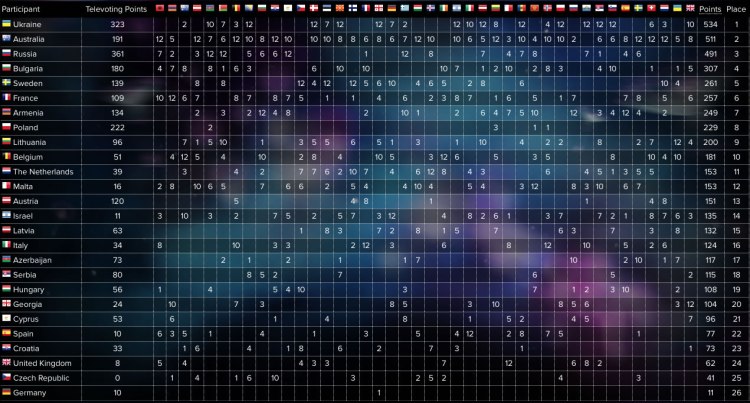 A new scoring system was introduced this year, providing separate scores for each country’s jury and public votes, rather than combining them as in previous years. At the half-way point after the juries’ votes had been counted, Australia – which had been invited back to perform after last year’s 60th anniversary celebrations – topped the scoreboard with 320 points and a firm lead over Ukraine’s 211 points. But Dami Im’s Sound of Silence failed to strike the same chord with the public and was voted the fourth most popular song overall. The new scoring system highlighted the disparity between the preferences of the juries and the public. It allowed Poland, which was in penultimate place with seven points from the jury, to leap to eighth when the public’s 227 points were taken into account.